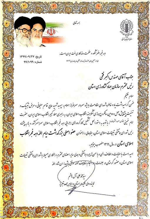 نماینده محترم ولی فقیه در استان و امام جمعه تبریز در حکمی رئیس سازمان جهاد کشاورزی استان آذربایجان شرقی را به عنوان عضو اصلی بزرگداشت ایام الله دهه فجر انقلاب اسلامی استان در سال ۱۳۹۹ منصوب کرد.