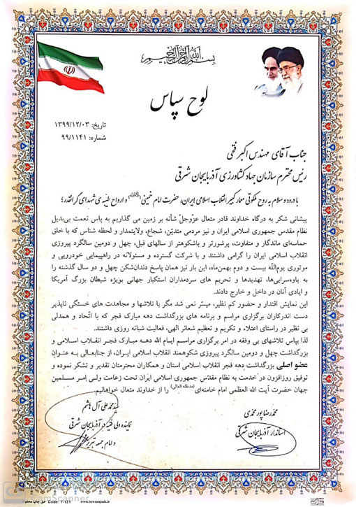 نماینده ولی فقیه در استان و امام جمعه تبریز و استاندار آذربایجان شرقی با اهدای لوحی به رئیس سازمان جهادکشاورزی استان از تلاشهای بی وقفه ایشان به عنوان عضو اصلی بزرگداشت دهه فجر انقلاب اسلامی استان در امر برگزاری باشکوه مراسم یوم الله دهه فجر و بزرگداشت چهل ودومین سالگرد پیروزی شکوهمند انقلاب اسلامی ایران تجلیل نمودند.