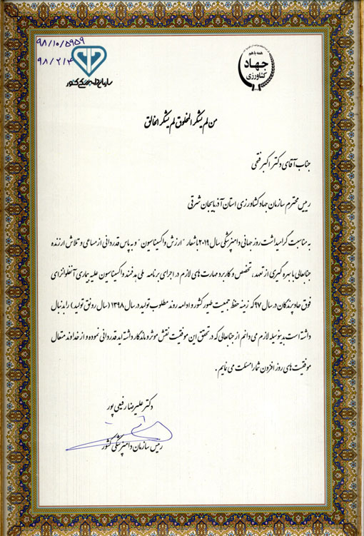 تقدیر رئیس سازمان دامپزشکی کشور از رئیس سازمان جهادکشاورزی استان آذربایجان شرقی به جهت کنترل آنفلوانزای فوق‌حاد پرندگان