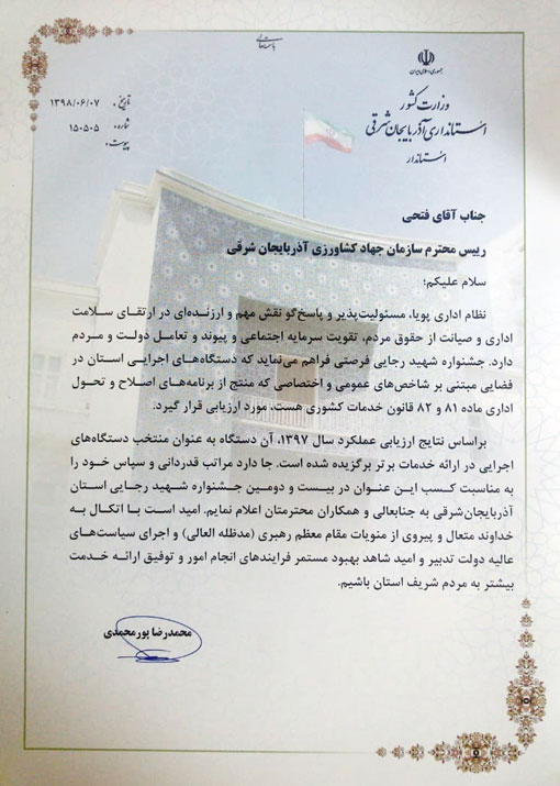 سازمان جهادکشاورزی استان آذربایجان شرقی دستگاه منتخب دستگاه های اجرایی استان در ارائه خدمات برتر